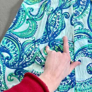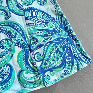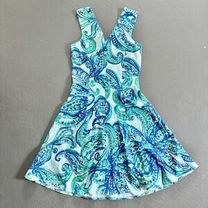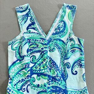 Fun and flirty Lilly Pulitzer dress in a soft terry cloth with classic preppy vibes. Features a flattering A-line fit and flare cut with wide straps and a V-neckline. The bright blue and green floral paisley print makes this a perfect pick for vacation, cruises, or spring and summer lounging.