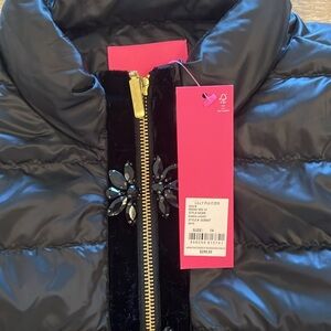 This Lilly puffer jacket is stunning with the velvet trim and glittering rhinestones down the front. IMO this jacket would be best for cool days, not cold, because it is lightweight. Approximate measurements lying flat: armpit to armpit: 21.5”; length: 27”.