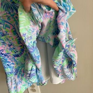 Pretty and flowy Lilly Pulitzer dress with ruffle tie front details - perfect for warm weather or on vacation during summer time!