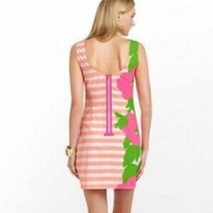 A shift dress layered with sorbet stripes and lively florals showcases your free spirit. Features exposed back zip closure w/ grosgrain trim and bow detail.