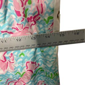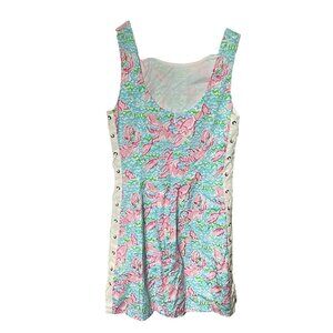 The Lilly Pulitzer Delia Dress in Women’s size 6 features a fun lobster print in a colorful multicolor design, perfect for summer, fall, and spring occasions like parties, cocktails, or casual outings. This sleeveless dress has a scoop neckline and strappy sleeves, with lace-up sides and a zipper closure for added style and functionality. Made from 100% cotton with a woven fabric type, this short dress is machine washable and lined for comfort. Perfect for beach-themed events and showcasing the brand's signature colorful and floral designs.