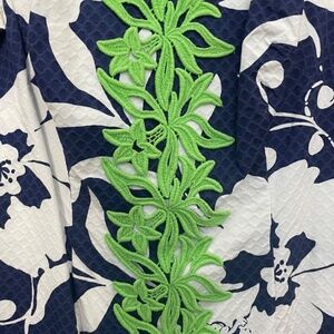 -Pattern Name: Johnny B -- Navy and white jacquard fabric in hibiscus print with lime green lace appliqué down the front