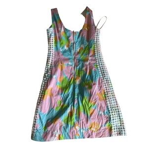 Lily Pulitzer mini dress , bright colorful shift style , zip closure , crochet lace detail