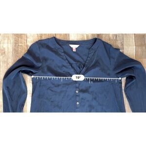 Lilly Pulitzer Delphine Stretch Silk Dress sz Medium Navy Blue. Stretchy tunic style and beautiful neck details with signature LP Gold buttons. 90% Silk 10% Spandex. Comes from 2016 collection. Item in excellent gently used condition. Dry cleaned only never washed. Dry clean for best results and the longevity of the garment. No known rips, tears, holes, stains or defects. Retails $198