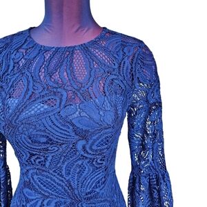 Features beautiful and bold royal blue floral loopy lace, round neck, 3/4 lace bell sleeves, partially lined, hidden romper shorts, mini dress, scalloped hems, hidden back zipper with hook eye closure, sorority girl, preppy, wedding guest, bridal shower, baby shower attire.