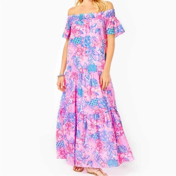 Lilly Pulitzer Dezi Off Shoulder Maxi Dress Pink Snappy Turtle