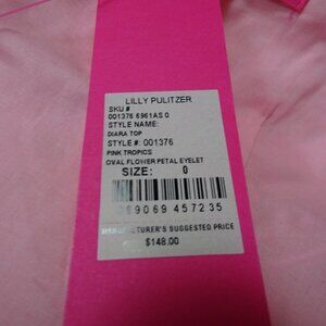 Lilly Pulitzer Diara Top "Pink Tropics Oval Flower Petal Eyelet" Zipper on back of top Shoulder tie 100% cotton Measurements laying flat: underarm to underarm 15.5" shoulder to shoulder 12" top of shoulder at neck to end of front hem 22.5" Questions? Leave a comment below!
