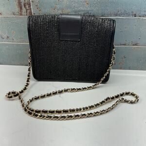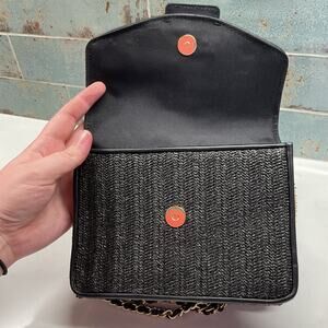 -Features: Textured herringbone design, gold metal chain and strap, logo detail on front,