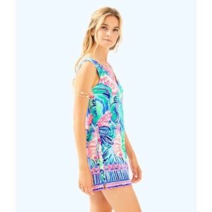 Brand new with tags. Lilly Pulitzer Donna Romper Floral Print Dress. Shift dress appearance with romper underneath (3” inseam). Side slits with tie detail. Hidden zipper on back with eye hook closure. 100% polyester. Size 00.