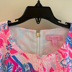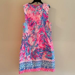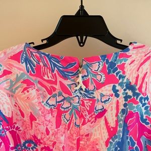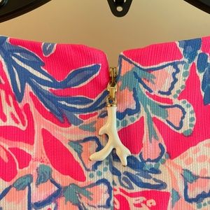 Worn once, in perfect condition. Vibrant colors and beautiful pattern making it the perfect above knee, summer dress. White and gold coral piece is.an adorable addition it the back zipper.