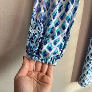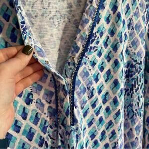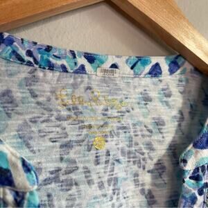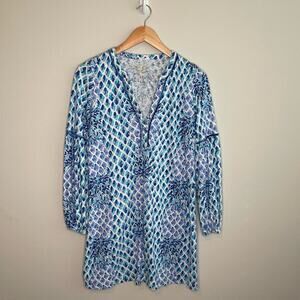 Lilly Pulitzer Joy Knit Tunic Mini Dress in Bright Pineapple Toe. The Joy Dress is a favorite day dress! Its printed tunic bodice and long blouson sleeves are perfect for those breezy days. Easy engineered tunic fit, gold metallic & blue fringe trim, notch v neckline, in an allover bright aqua blue pineapple print. Features a split neck, long sleeve Printed on all over the dress, snap button detail on neckline, Slit Cut On Both Sides, lace fringes on neckline & sleeve, and elastic sleeve cuff. Excellent preowned condition: light wash wear but no major flaws.