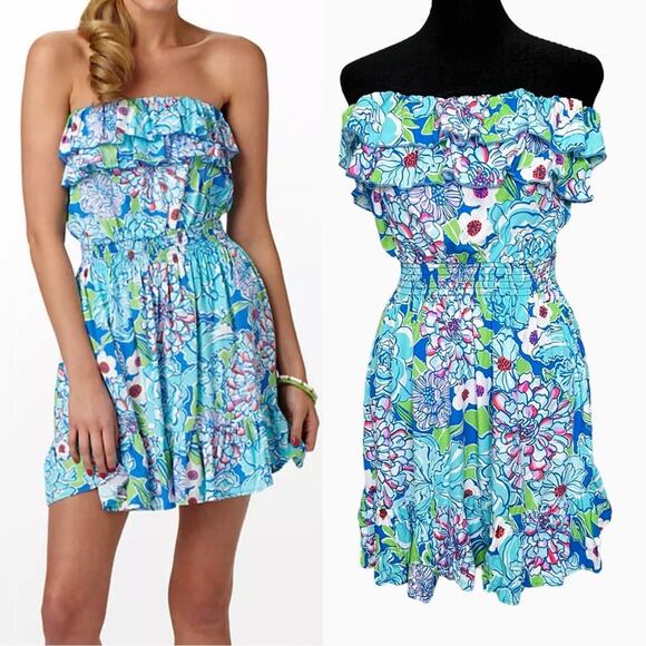 Lilly Pulitzer Dress Quincy Worth Blue May Flowers Strapless Beach Vacation S