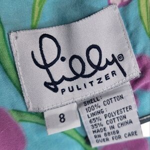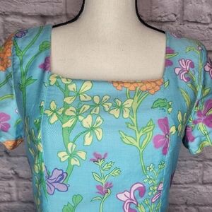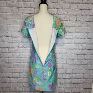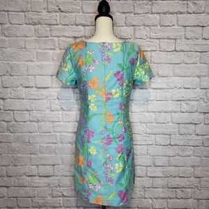 Lilly Pulitzer dress in a turquoise blue floral print. Print name is Sassafrass. Has a square neckline, short sleeves, Sheath style with a back zipper closure. Excellent preloved vintage condition.
