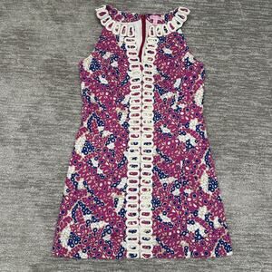 Lilly Pulitzer Dress Womens 12 Pink Blue Shift Sleeveless Lace Trim Printed