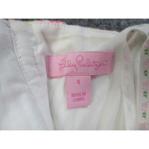 Labels and identifiers: Interior pink Lilly Pulitzer neck label with script logo and separate size tag marked 4 and Made in China. Inner content tag reads 100% Cotton, Made in China, RN# 88189, See Reverse For Care. Additional production tag lists 577, Hangzhou, China, Mar-13, Style 53044, PO 041235.