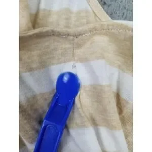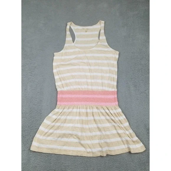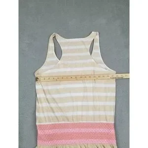 Womens sleeveless racerback knit dress with tan and white horizontal stripes and a pink smocked waistband.