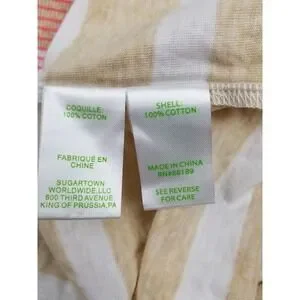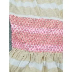 Colors: beige/tan and white stripes with pink geometric stitch waist panel.