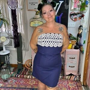 Strapless mini or above the knee dress. Empire waist. Elastic gathering along the bust line for secure fit. Lined.