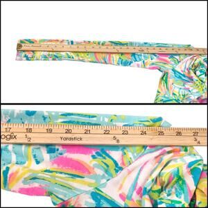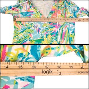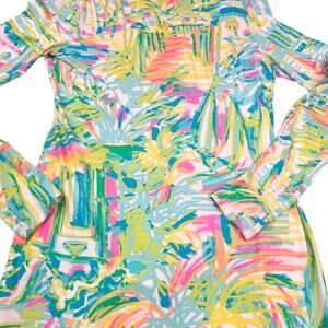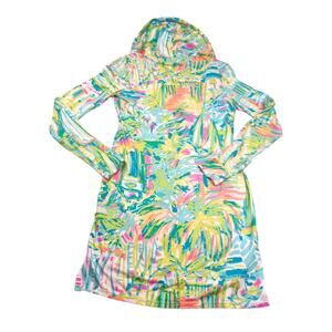 Very good condition, swim cover up dress by Lily Pulitzer in a size extra small. Could fit a small or even a medium in my opinion since I often wear mediums but please see measurements. It does have a little bit of stretch. Has front pockets, a hood, and pockets. Super cute for your next vacation! No rips stains or tears.