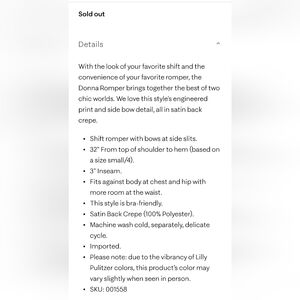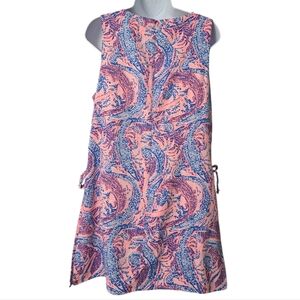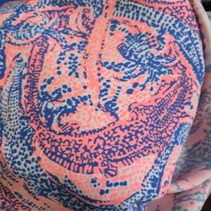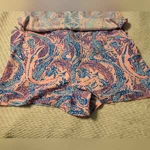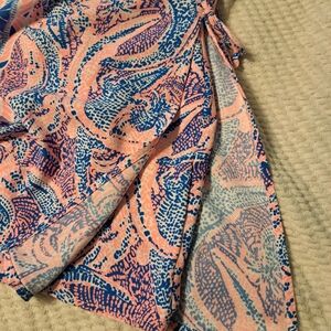 Pink and blue Maybe Gator Donna romper by Lilly Pulitzer. Attached shorts, spit side dress with bows. Hard to get a good picture of the actual color but it is pink and blue. First two pics from internet. See pics for measurements anddescription. Very gently worn.