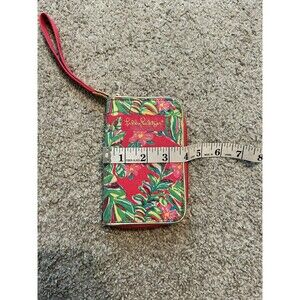 This Lilly Pulitzer Drop Me A Line Jungle Tumble Wallet Wristlet is a stylish accessory for women. It features a colorful floral pattern and is made of durable nylon material. The wallet has a strap and zipper accents, with a credit card and phone pocket for added convenience. It measures 7 inches in length and 4 inches in width, making it the perfect size for everyday use. The wallet is not personalized and has no vintage elements. It is a designer piece, perfect for those who love the beach, nautical or American themes, as well as those who enjoy palm or Hawaiian motifs.