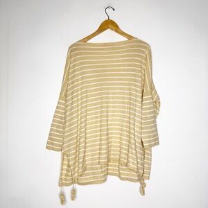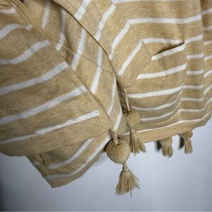 Stylish beige sweater with stripes. Features tassel details on the side. Perfect for casual wear.