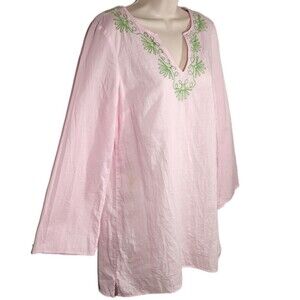 Lilly Pulitzer Elina Tunic Dress Cotton Slub Embroidered Pink Green Swim Beach Pool Cover Up Long Sleeve Lightweight