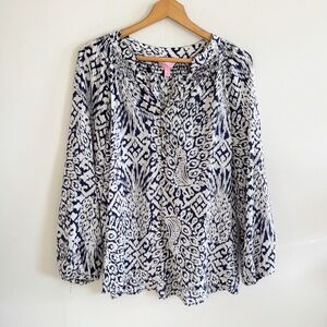 Lilly Pulitzer Elsa 100% silk navy blue pineapple party print peasant top sz L