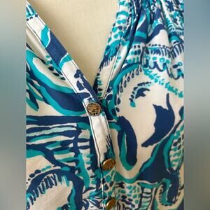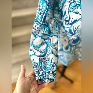 Excellent condition. Blue and white elephant pattern, with gold Lilly logo buttons on the front. Long sleeves, loose fit.