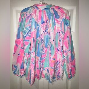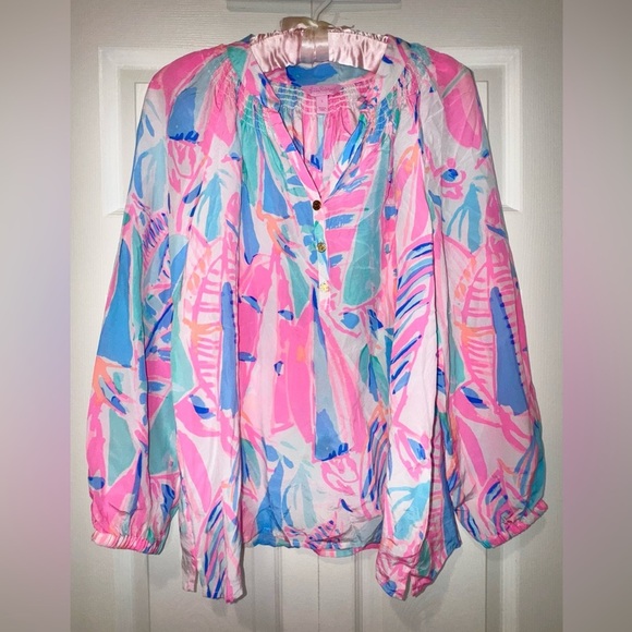the iconic Lilly Pulitzer Elsa Top is a must-have for any wardrobe. This vibrant “Out to Sea” print features a lively mix of pink, blue, coral, and aqua in a tropical abstract pattern. Crafted from luxurious silk, this tunic-style blouse offers a relaxed fit with smocking at the neckline, button placket, and billowy long sleeves with elastic cuffs.