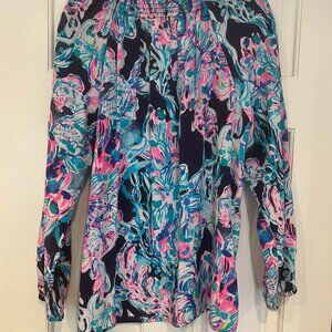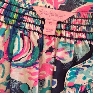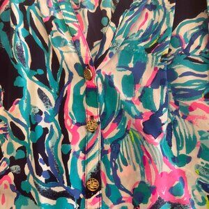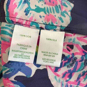 Lilly Pulitzer Elsa Silk Blouse Navy Background - Size XL