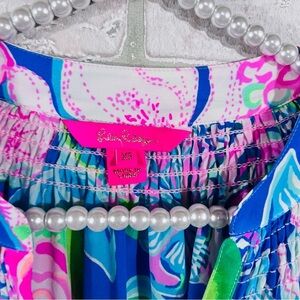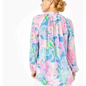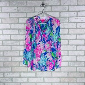 Elevate your style with this Lilly Pulitzer blouse, featuring a vibrant pink and blue graphic design. The long sleeves and mandarin collar add a touch of elegance, while the buttoned front offers a classic look. Perfect for adding a pop of color to any outfit.