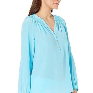 Lilly Pulitzer Elsa Silk Top Blouse Long Sleeve Smocked Neck Bali Blue Size XL