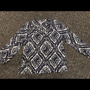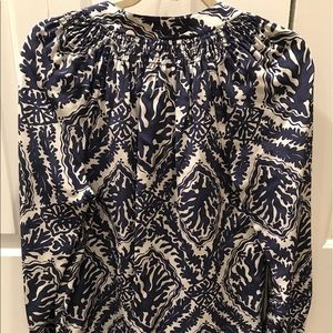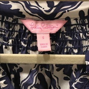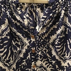 Barely worn. Excellent condition! Lilly Pulitzer Elsa top has a v-neck and banded sleeves. Gold button detailing. 100% silk. Dry clean only. Loose fitting. Great top that can be dressed up or down! Price is firm. No trades please!