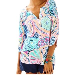Lilly Pulitzer Elsa‎ Top Tile Wave Egret Henley Linen Size Small Women