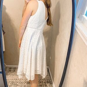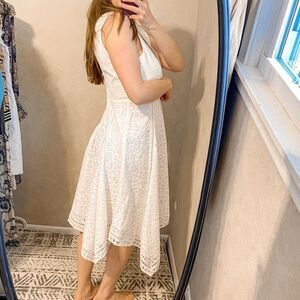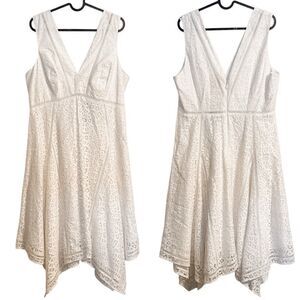 Features: sleeveless, V neck and back, hidden back zipper, handkerchief hem, oyster shell lace, resort white