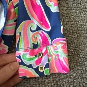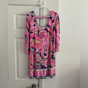 Gently-used Lilly Pulitzer Emma Knit Dress in size small. Features 3/4 sleeves with gold buttons at the cuffs.