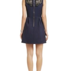 Lilly Pulitzer Emmy Dress in True Blue (Navy) with Black Soutache Trim. Sleeveless A-Line Fit and Flare Dress with POCKETS!! Who doesn’t love a dress with pockets? Fully Lined. Beautifully detailed in black. Zipper has a palm tree etched.