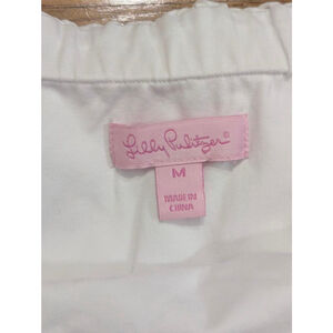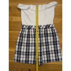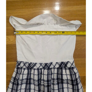 Lilly Pulitzer women's strapless dress, size medium. Features a white ruffled stretch bodice and a navy blue and white plaid bottom. The navy is very dark, appearing almost black. The plaid section has a textured, seersucker-like appearance and includes two side pockets. The waistline is elasticized. The dress has a white lining in the bottom half.