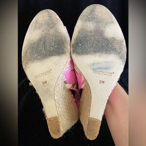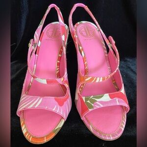 Lilly Pulitzer Espadrille Sling Back Wedge Logo Pink Floral Peep Toe sz 9M