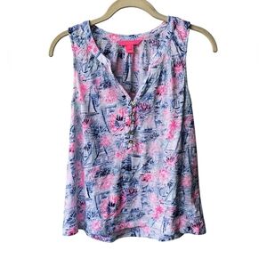 Lilly Pulitzer Essie Sea to Shining Sea Sleeveless Popover Blouse, S. This relaxed, sleeveless blouse by Lilly Pulitzer showcases a vibrant floral pattern in shades of blue and pink. Perfect for a casual yet stylish look. Crafted from a light, flowing fabric, it's ideal for warm weather outings. In excellent pre-loved condition