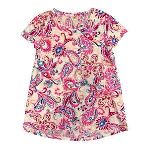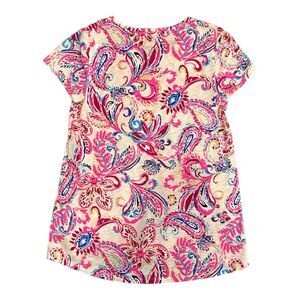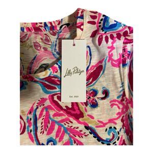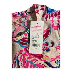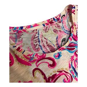 Lilly Pulitzer Etta Scoop-Neck Top Womens Size M Lets Pawty Print is a bright and playful tee featuring vibrant pink, blue, and gold tropical patterns with a soft cotton feel. Designed with a high-low hem thats shorter in the front and longer in the back for a relaxed, flattering fit.