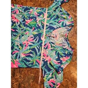 The Lilly Pulitzer Etta Small V Neck Sweet Escape Shirt is a vibrant and colorful top perfect for a preppy and beachy look. Made of cotton knit fabric, this shirt features long sleeves and a V-neck neckline for a stylish and comfortable fit. The pullover closure and casual sleeve type make it ideal for travel or casual occasions, while the blue floral pattern adds a touch of spring to the basic style. Machine washable and in size S, this Lilly Pulitzer shirt is a must-have for any fashion-forward woman's wardrobe.