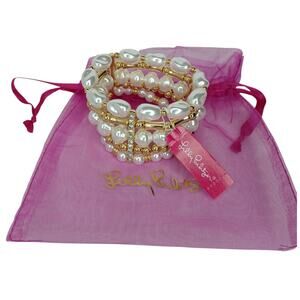 Add a touch of elegance to any outfit with this 5-layer Lilly Pulitzer stretch bracelet . Featuring lustrous faux pearls, gold-tone beads, and sparkling rhinestone bar accents, thIs bracelet offer effortless style and comfort. New with tags and includes the original pink Lilly Pulitzer organza pouch—perfect for gifting or keeping.