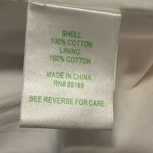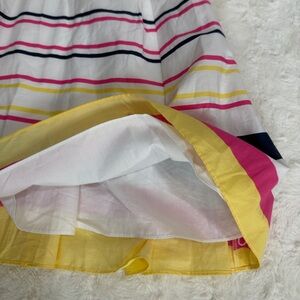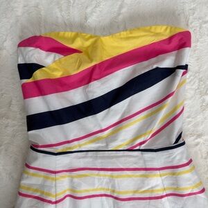 It is a multi-colored striped dress featuring horizontal bands in white, pink, navy blue, and yellow. Strapless, A-line silhouette with a sweetheart neckline and a pleated skirt. Fully lined, side pockets and a smocked back. Excellent preowned condition
