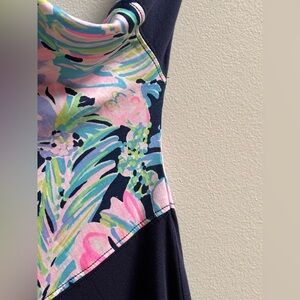 In excellent new-without-tags condition. This easy-fit Finn dress by Lilly Pulitzer is a comfortable and stylish staple made from soft 100% pima cotton jersey. Features include long sleeves, dropped shoulders, a solid navy body and sleeves, and vibrant Bermudaful print details along the neckline and hem. Designed with a boat neck and above-the-knee length, it’s perfect for beach trips, vacation, travel days, or a polished casual look. Lightweight, breathable, and colorful for year-round wear.