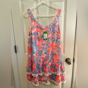 Vibrant floral dress with pink and blue patterns. Sleeveless design. Features a playful hem with pom-pom details.