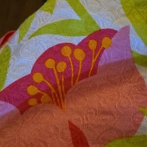 Lilly Pulitzer vibrant strapless dress featuring a floral pattern. Includes pink, yellow, and lime hues on white background. Empire waist with wide pink grosgrain ribbon. Built in stays with stretch band in back with bra closure. Back zipper. Slit in back. Fully lined.