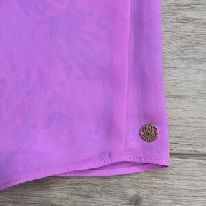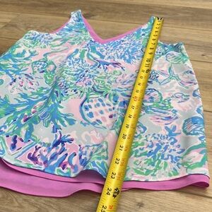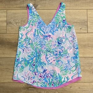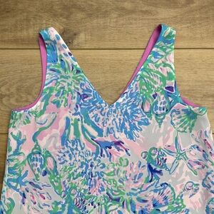 Slinky and reversible v neck tank top in Lavander Craysea by Lilly Pulitzer. A great tank to dress up or down! Flowy fit perfect for every day wear. The light blue and green print features and underwater coral scene with sea shells and star fish. The “Craysea” print reverses to a solid purple that is just sheer enough to see a shadow of the print below. One very minor pull as pictured, otherwise excellent condition, the tag was removable for reversible wear, it is a size Extra Small XS - See Measurements