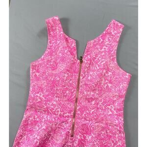 The Lilly Pulitzer For Target Upstream Lined Shift Dress in women's size 10 is a stylish and colorful option for various occasions. Featuring a floral pattern in pink, this sleeveless dress has a scoop neckline and a zip closure. Made from a comfortable and stretchy cotton-spandex blend, the dress is machine washable for easy care. With a short length and a tank top sleeve type, this dress is perfect for summer, fall, and spring events like weddings, parties, or casual outings. The Lilly Pulitzer brand adds a touch of luxury and flair to this chic shift dress.